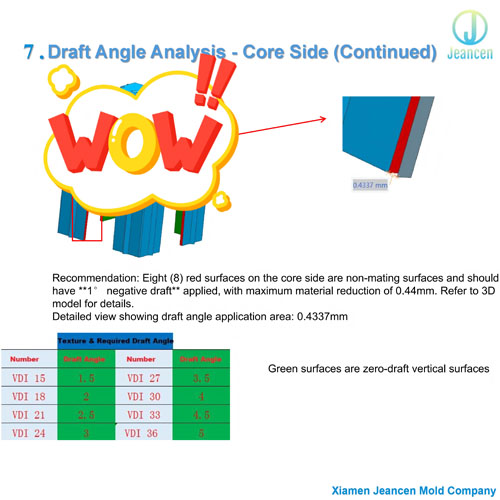 Since the part required a heavy texture (VDI 36), we recommended specific draft angles. Our analysis ensured that the part could be ejected smoothly without dragging or surface damage, even with the complex core-side geometry.