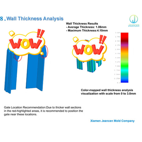 We performed a color-mapped wall thickness analysis to identify potential "hot spots." By identifying thicker sections, we recommended the optimal gate location to prevent sink marks and ensure uniform material flow.