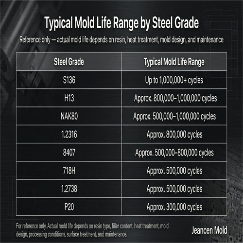 Note: These ranges are for reference only. Actual mold life depends on resin type, filler content, heat treatment, mold design, cooling, processing conditions, surface treatment, and maintenance.